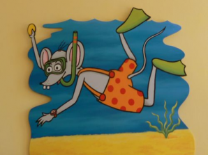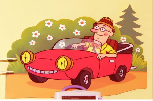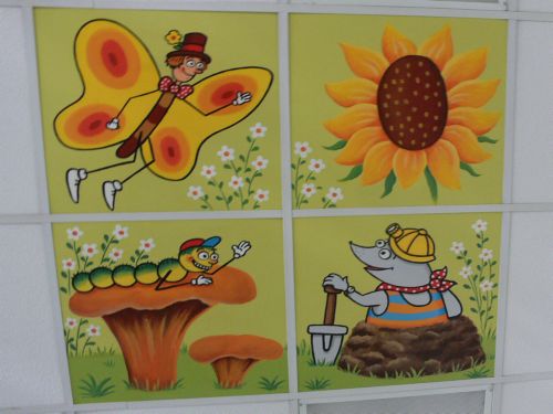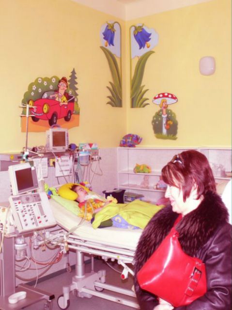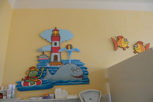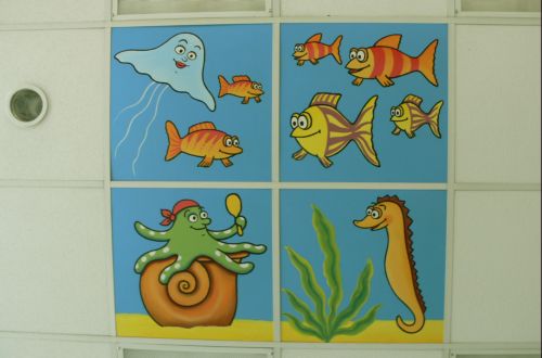 Místnost pro chronické pacienty a chodba jsou proto vyzdobeny tvarovanými obrázky s dětskými motivy. Obrázky nejsou malovány přímo na zeď, ale na desky, které se pak na zeď, resp. na strop upevní. Důvodů je hned několik - výmalba na zdi by trvala i několik dní, obrázky se mohou libovolně měnit z místa na místo a v neposlední řadě nebudou přenosné obrázky překážet při každoroční standardní výmalbě místností, která je v těchto prostorách nutností. Rovněž budou snadno omyvatelné při pravidelných úklidech.